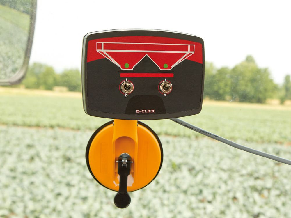 Sterowanie otwieraniem i zamykaniem wylotu odbywa się bezpośrednio za pomocą dwóch siłowników elektrycznych po jednym z każdej strony obsługiwane z kabiny ciągnika przez sterownik E-Click z dwoma przełącznikami elektornicznymi zamiast zaworów hydraulicznych!